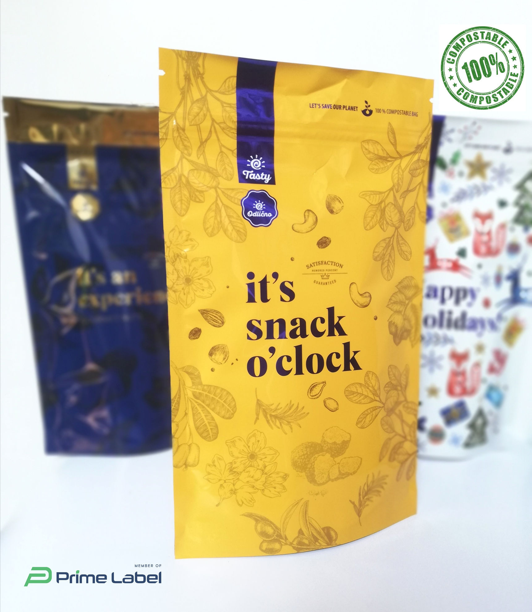 V LabelProfi vam ponujamo pester nabor okolju prijaznih embalažnih rešitev, ki niso le reciklabilne, ampak so celo kompostabilne. Za vse vgrajene materiale imamo certificate TÜV Austria. Po uporabi izdelka lahko takšno kompostabilno embalažo, s kompostabilnim zip sistemom zapiranja, preprosto odvržete v domač kompostnik oz. industrijsko kompostiramo z vsemi znanimi tehnikami, ki so na voljo.